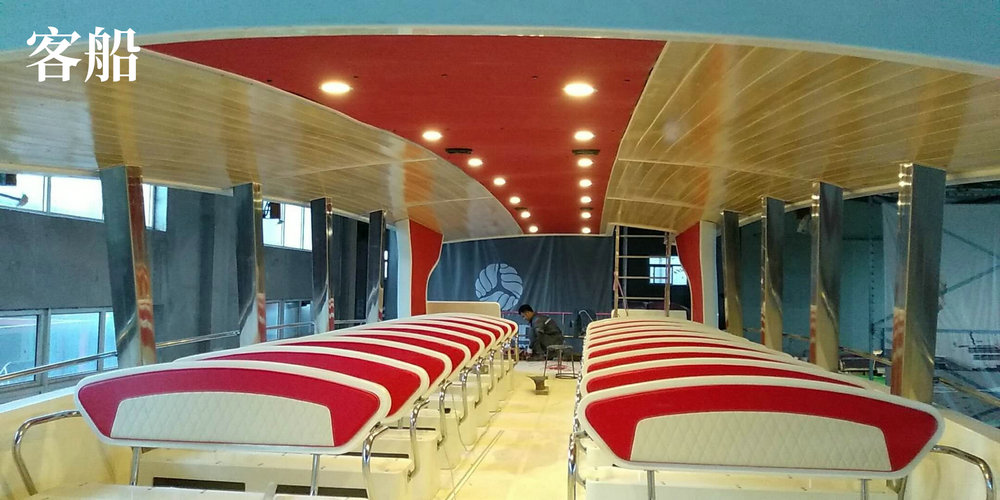 15 米双体客船的双体设计提高了船只的稳定性,减少了水面的阻力,并避免了明显的摇晃。这条 15 米双体客船配备了红白色相间的座椅,与船体的颜色相匹配。船体和坐垫的所有颜色都可以定制。这条船在旅游景点非常受欢迎。
